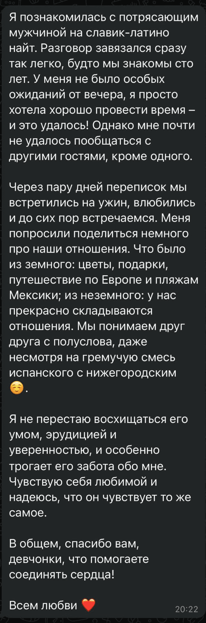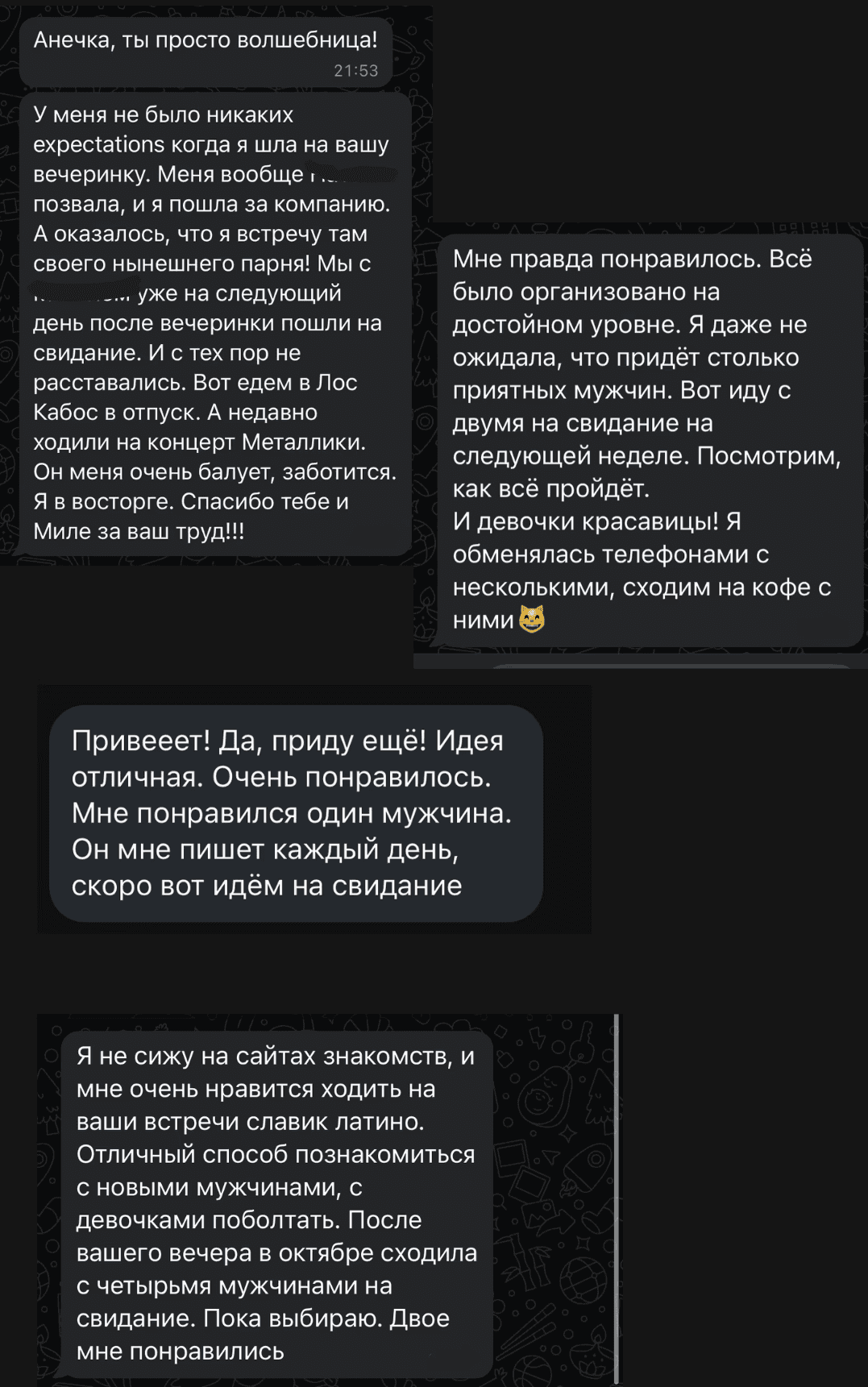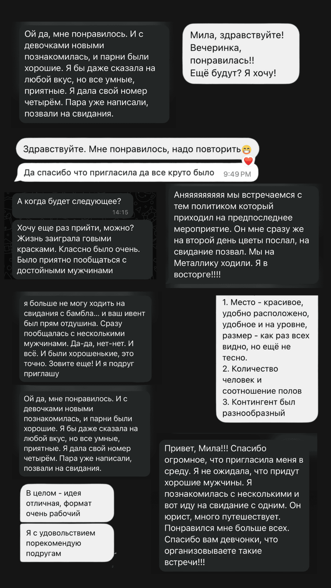После наших предыдущих мероприятий уже образовались множество счастливых пар! Девушки путешествовали по Европе, отдыхали на море, получали цветы и подарки. Почти все участницы нашли себе партнеров и продолжили общение после встречи.